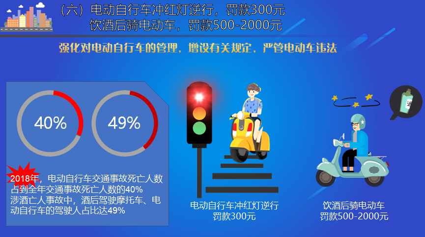 對於重罰買賣分的違法行為,修訂條例規定,替代記分的,分別暫扣駕駛證;買賣分的,並處罰款;中介,處罰款,有其他情節,並處拘留;對電動單車沖紅燈逆行的行為,罰款300元;對飲酒後騎電動車的行為,罰款500-2000元。