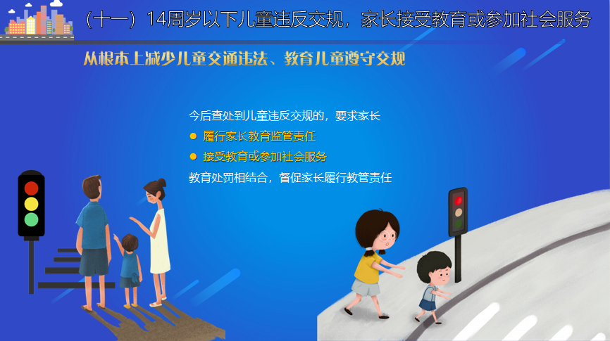 14周歲以下兒童違反交規,家長接受教育或參加社會服務。作為監護人應當保障兒童的交通安全,兒童違反交規的,今後查處到兒童違反交規的,要求家長履行家長教育監管責任並接受教育或參加社會服務,教育處罰相結合,督促家長履行教管責任,從根本上減少兒童交通違法、教育兒童遵守交規。