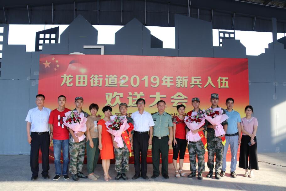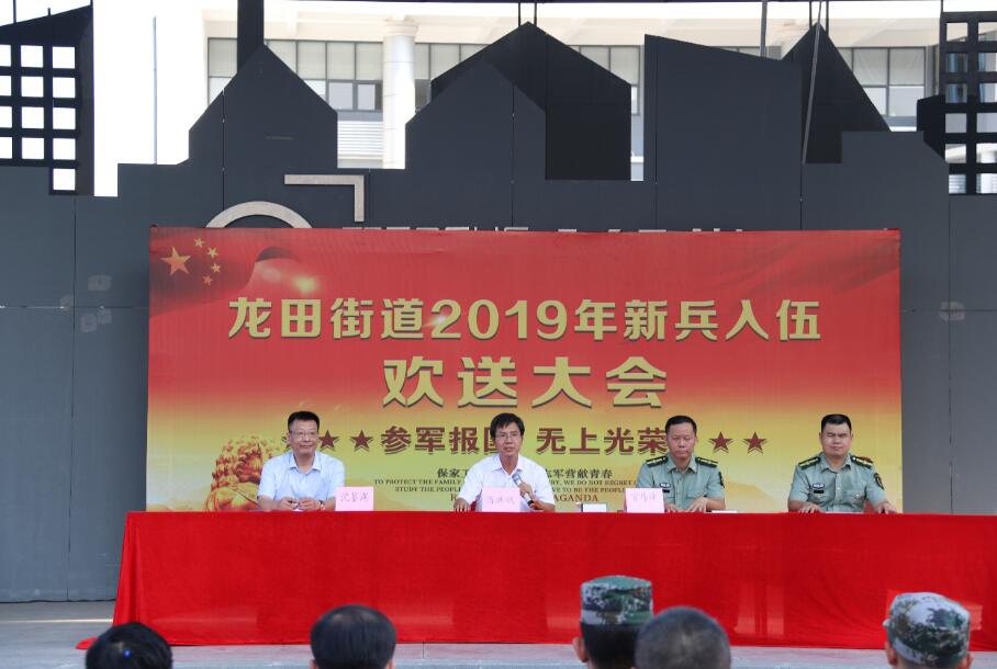 【香港商報訊】記者焦家志 通訊員李含濤報道: 9月9日下午,深圳市坪山區龍田街道召開2019年新兵入伍歡送大會,龍田街道黨工委副書記、辦事處主任潘洪斌,街道黨工委委員、武裝部部長官偉舜,街道辦事處副主任沈鑒湖,街道各部門負責人、街道徵兵辦、各社區書記以及新兵家長參加了本次歡送活動。
