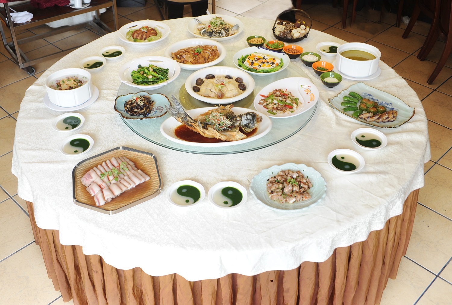 菜單重視營養互補與酸鹼平衡,以太極鴛鴦養生羹、賀街豆腐四寶燴、煎釀賀州珍三寶、茶油長壽農家綠、賀州幸福雞樅菌、養生粗糧五色拼等素食菜餚,提供維生素、纖維素,並以鉀、鈣、鈉等鹼性元素,中和肉類產生的酸性物質。食客可根據個人口味及用餐人數,選擇適合5至6人用的小型宴、10至12人用的標準宴,以及12至16人享用的接待宴。