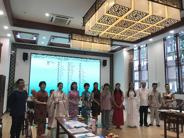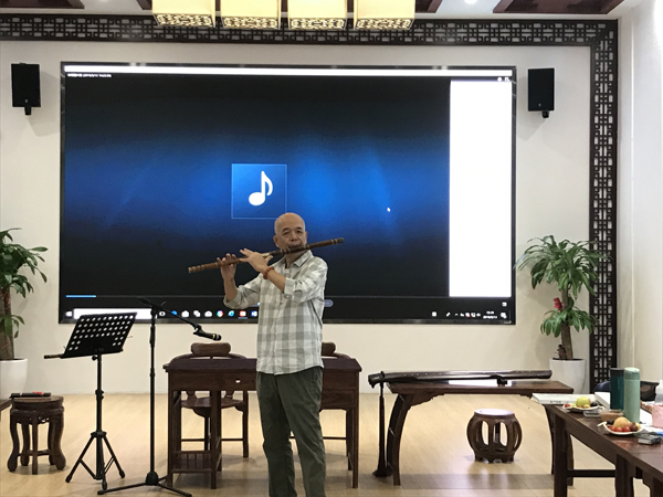 活動現場清音回轉,雅韻悠長。深圳市和雅昆曲協會的曲友現場合唱《長生殿•驚變•泣顏回》,趙東曉表演笛子獨奏《秋湖月夜》,還有《牡丹亭》“遊園”、“驚夢”,《長生殿•哭像•脫布衫帶小梁州》等多首曲目,另外,還有古琴、笛、簫等演出。