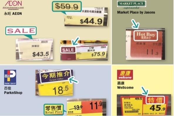 調查發現,在價錢牌上一併展示真實售價及刪除價的促銷做法十分普遍。42款貨品中,比率最高為「惠康」及「Market Place by Jasons」,分別有37款及38款以此方式提示價格優惠,比例約九成,「百佳」在23款貨品作出價格比較標示,「AEON」則有20款。