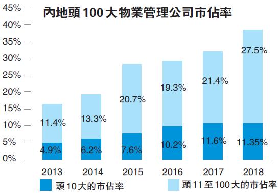 內地物管行業整體分布仍然頗為分散,排名前10位的物管企業市佔率約11.35%,前100企業的市佔率約38.85%,未來仍有相當多的整合機會。按產品分類,住宅物業管理佔市場收入的46%,辦公室佔比20%,商業項目帶來14%的收入。在不同類型的住宅當中,辦公樓等物業可收取的管理費較高,料物業管理公司會很願意增加此部分的比例。