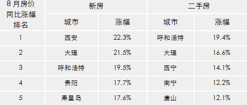 值得注意的是,從同比漲幅看,西安新房價格已經連續9個月領漲全國,呼和浩特二手房價格連續10個月漲幅全國第一。