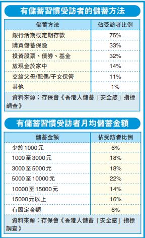 港人的儲蓄形式多樣,調查發現,最多受訪者以銀行存款進行儲蓄,比例高達七成半,其後為購買儲蓄保險和投資股票、債券、基金。