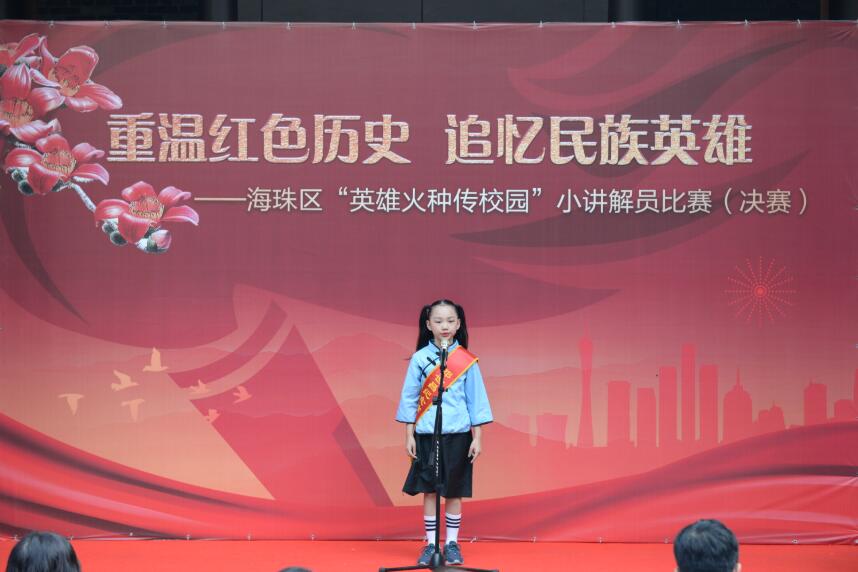 ”英雄火種傳校園“小講解員比賽,由海珠區委黨史研究室、海珠區教育局、海珠區文廣旅體局共同主辦,以”重溫紅色歷史、追憶民族英雄“。來自海珠區”英雄火種傳校園“小講解員比賽活動有鄧世昌紀念小學、衛國堯紀念小學、同福西路小學共八間小學近8000名學生參與。
