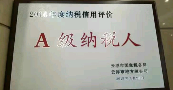 雲浮市華中石材實業有限公司獲得2014年度A級納稅人牌匾