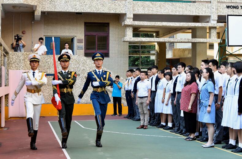 上午8時許,學生於操場集合,整齊站立。解放軍駐香港部隊儀仗隊官兵踏著正步攜國旗入場,全體師生行注目禮。隨伴奏聲起,全場同唱國歌,注視國旗緩緩升起。隨後,校方向儀仗隊官兵致送紀念品。