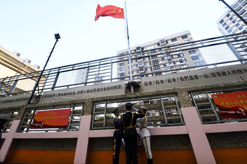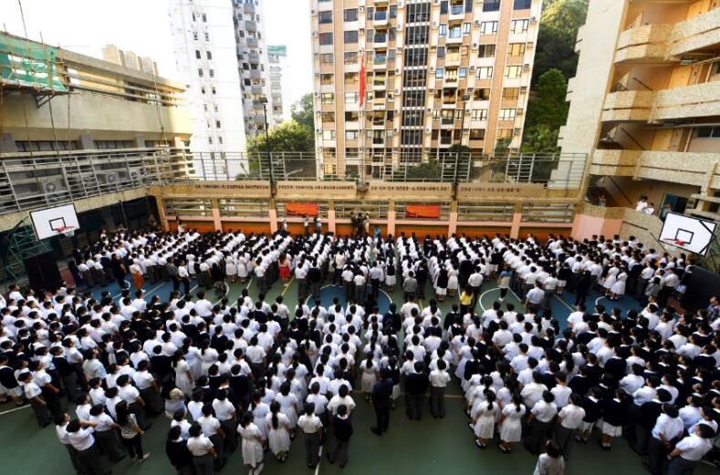 培僑中學全體師生向國旗行注目禮。中新社