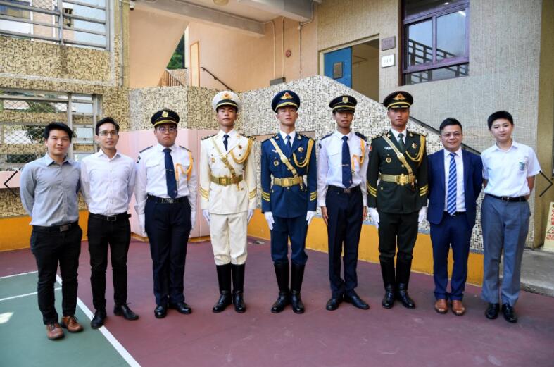 駐港部隊儀仗隊官兵與培僑中學校長及師生合影留念。中新社