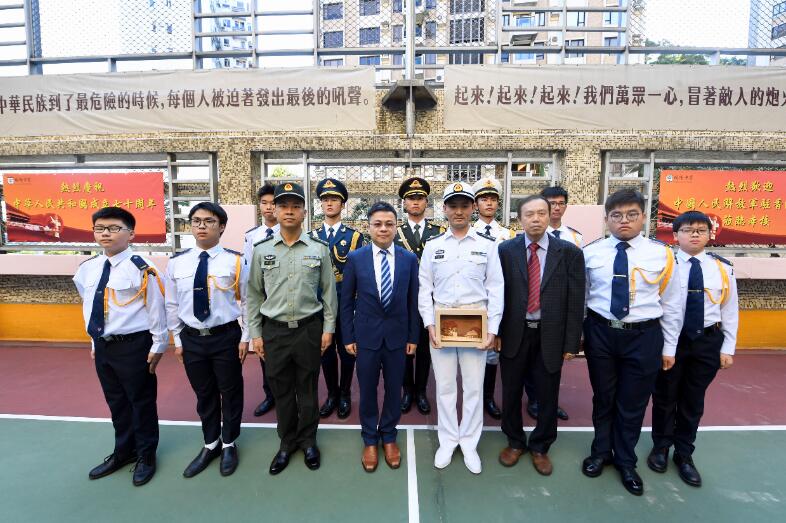 培僑中學校方向駐港部隊儀仗隊官兵致送紀念品。中新社