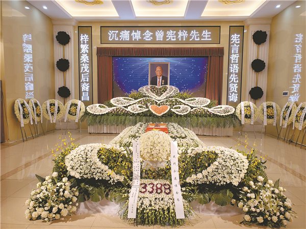 靈堂中央,曾憲梓遺體覆蓋國旗,莊嚴肅穆。大堂正中懸掛着「沉痛悼念曾憲梓先生」橫幅,輓聯寫着:「憲言哲語先賢誨,梓繁桑茂後裔昌」,中間是曾憲梓的遺像。