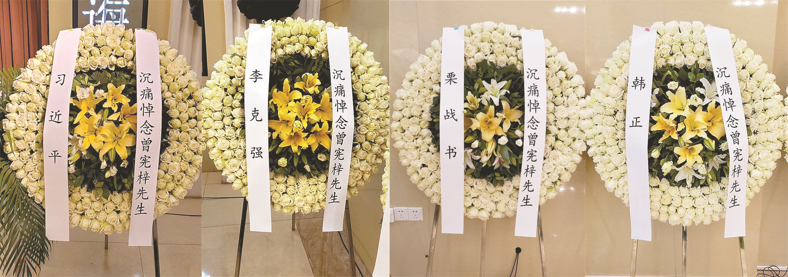 習近平、李克強、栗戰書、韓正等中央領導人敬送的花圈。