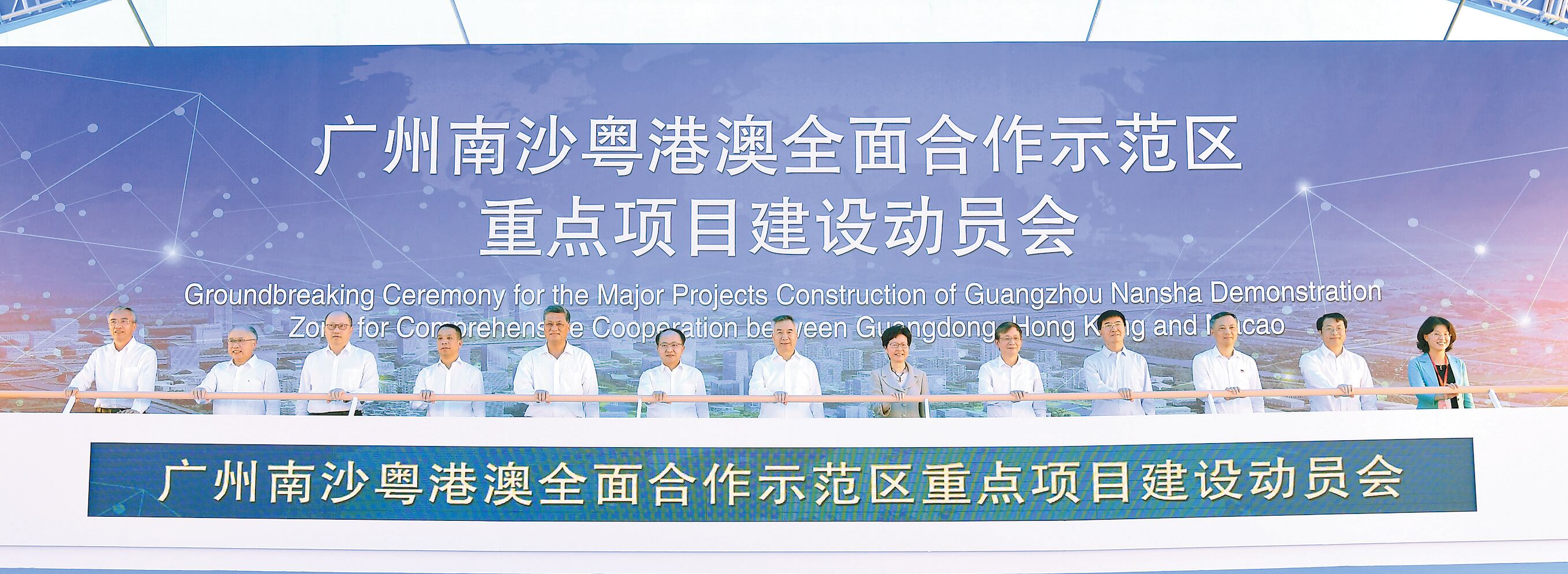 廣東省委書記李希(中)、特首林鄭月娥(右六)、中聯辦主任王志民(左六)、中國科學院黨組副書記侯建國(右五)、廣東省省長馬興瑞(左五)、全國人大常委會教科文衛委員會副主任杜玉波(右四)、國務院港澳辦副主任黃柳權(左四)、廣州市委書記張碩輔(右三)、科大校董會主席廖長城(左二)及其他嘉賓主持動員會啟動儀式。