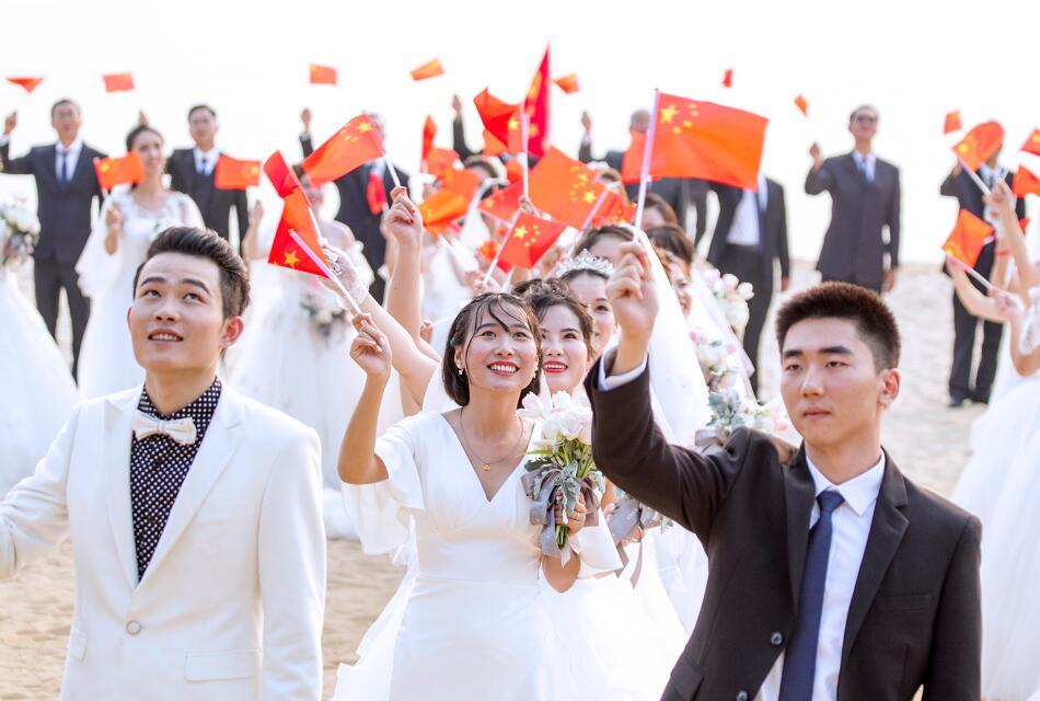 新人們揮舞國旗為祖國建國70周年歡慶