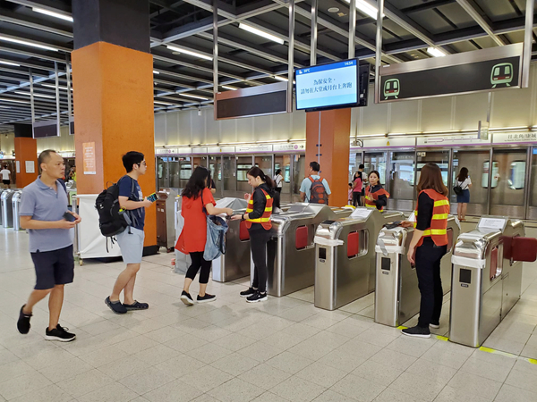 寶琳站8 日中午重開,惟仍有大批閘機被破壞待修,有職員手持八達通機協助乘客入閘。