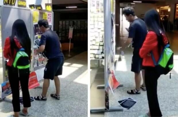 据台湾《中国时报》8日报道,位于台大第一学生活动中心、学生会设置的“连侬墙”上的挺香港暴徒海报,7日被一对陆客夫妻撕毁。现场目击学生将整段过程拍摄下来,协助校方报警处理。台北市大安分局一个派出所接到报案,经警方确认涉案人员为李姓大陆观光客,便将他带到派出所侦讯。台大学生会称将以毁损罪提出诉讼,并且不会撤告或和解。报道称,李姓陆客否认受人教唆,表示他10月1日与妻子来台自由行,前几天都在中南部一带游玩,7日到台北市并到台大校园参观,看到“连侬墙”上的内容,一时气愤撕毁海报。