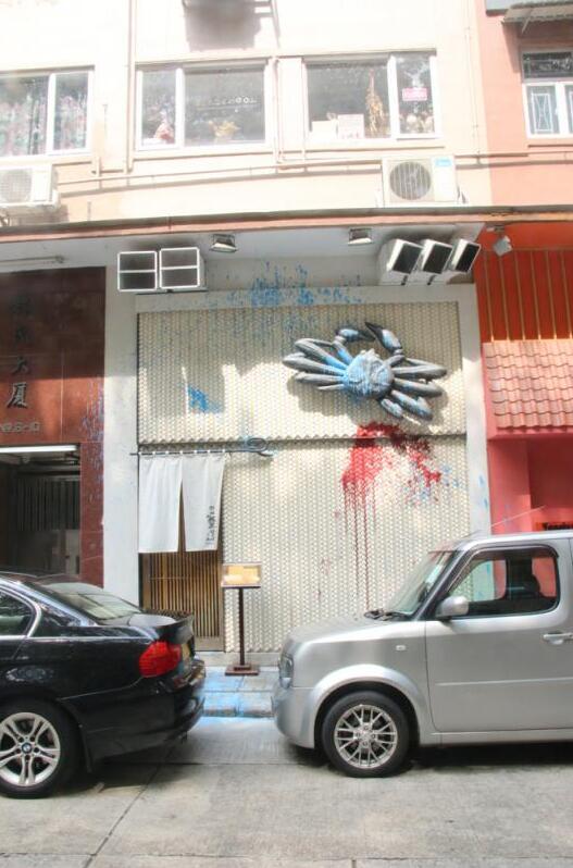 昨日上午十時許,位於中環九如坊6-10號林氏大廈地下一間日本壽司刺身蟹店、中環歌賦街29-31地下一間日本料理,以及中環雪廠街22號樂成行地下一間壽司店,牆身均被淋潑藍色及紅色油漆。九如坊餐廳的員工發現後報案,其餘兩間則沒有報警。