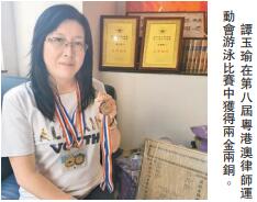 【香港商報网訊】由粵港澳三地律師協會聯合主辦、澳門律師公會承辦的第八屆粵港澳律師運動會日前在澳門舉行。香港代表隊譚玉瑜律師在女子游泳比賽中勇奪兩金兩銅四項獎牌。