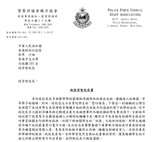 信件由警司協會主席、警務督察協會主席、海外督察協會主席、警察隊員佐級協會主席聯署發出,副本送行政長官林鄭月娥、政務司司長張建宗、教育局局長楊潤雄、保安局局長李家超、中文大學校董會主席梁乃鵬。