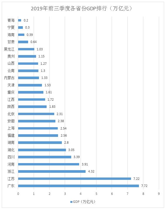 经济总量常年排名第三的山东,去年前三季度GDP为5.96万亿元,今年暂未公布数据。浙江前三季度GDP首次站上4万亿元大关,取得4.32万亿元成绩,同比增长6.6%。