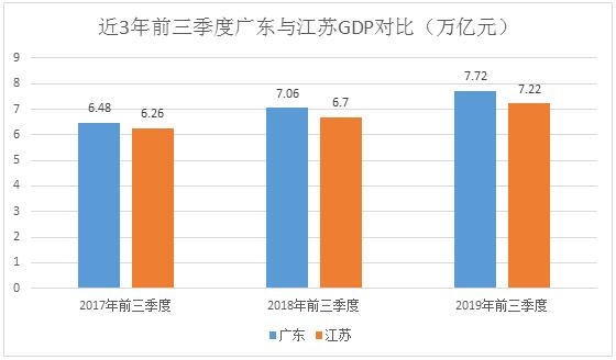 不过从近三年两省份前三季度的GDP来看,江苏追赶广东但差距略有扩大,从2017年前三季度江苏落后于广东0.22万亿元拉大到去年的0.36万亿元。今年前三季度,广东超越江苏0.50万亿元。