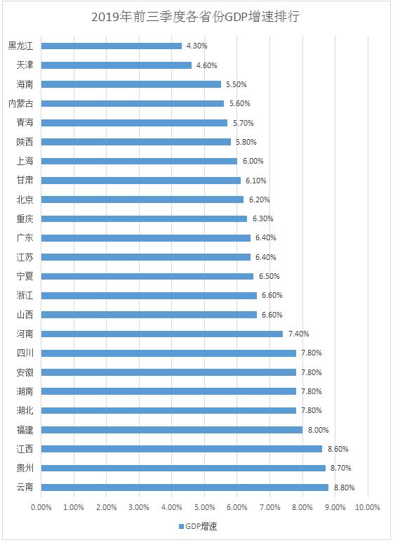 从今年各地政府工作报告来看,31省份中,天津、重庆、贵州等23省份下调今年GDP增速目标。实际上,已经公布成绩单的24省份中,17省份前三季度经济增速同比均有不同程度下滑;湖南、河南和重庆持平于去年同期;山西、内蒙古、海南和天津增速同比加快。