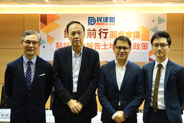 謝偉銓(左一)、黃澤恩(左二)及葉文祺(右一)出席民建聯舉行的土地房屋政策圓桌會議。右二為民建聯主持人李克勤。 記者 馮俊文攝