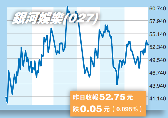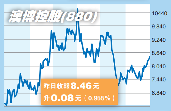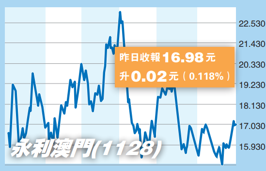 受有關消息刺激,濠賭股於本月14日紛紛造好,其中,永利、澳博(880)、銀娛(027)、新濠(200)、金沙(1928)及美高梅(2282)分別升5.7%、4.5%、4.3%、4.2%、3%及1.6%。