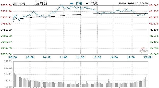 11月4日消息,早盘三大股指小幅高开后一路震荡走高,创业板指涨幅超1%,深成指、沪指同步拉升,早盘金融股、民航机场、消费电子、数字货币、医药等板块表现强势,受利空消息影响,电子烟板块走弱,午后两市整体维持窄幅震荡,早盘强势的数字货币午后跳水,易见股份(18.360, -0.56, -2.96%)、四方精创(29.010, 1.84, 6.77%)等涨停股炸板。整体上两市氛围尚可,个股方面涨跌各半。北上资金净流入超40亿元,连续第八个交易日净流入。截至收盘,沪指报2975.49点,涨0.58%,深成指报9868.13点,涨0.67%;创指报1699.92点,涨0.77%。