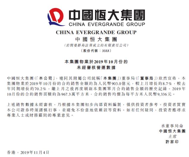 【香港商報訊】記者黃裕勇報道:11月4日,中國恒大(HK.3333)發佈公告,十月實現銷售903億,同比大增70.2%,連續兩個月創房企單月銷售歷史最高紀錄。今年前十月,恒大累計銷售5435億,目標完成率91%,提前超額完成全年6000億銷售目標已無懸念。