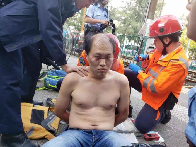 从现场视频看,一名身穿蓝色衣服的男子手捧鲜花靠近何君尧,和他聊天分散注意力,交谈期间双方表示合照,男子声称要先拿出手机,其後由斜背袋拔出一把刀,刺向何君尧。何君尧反应较快,受伤后还与其他人将这名男子按压在地上,并用索带将男子双手绑上。何君尧身穿的白色恤衫胸口位置染有血迹,救护员为他治疗後,由救护车将他送院。