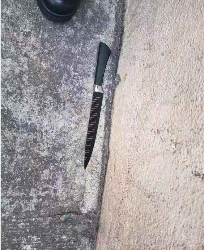 現場圖片顯示,何君堯前胸流血,現場遺下疑似凶器的黑色長刀。