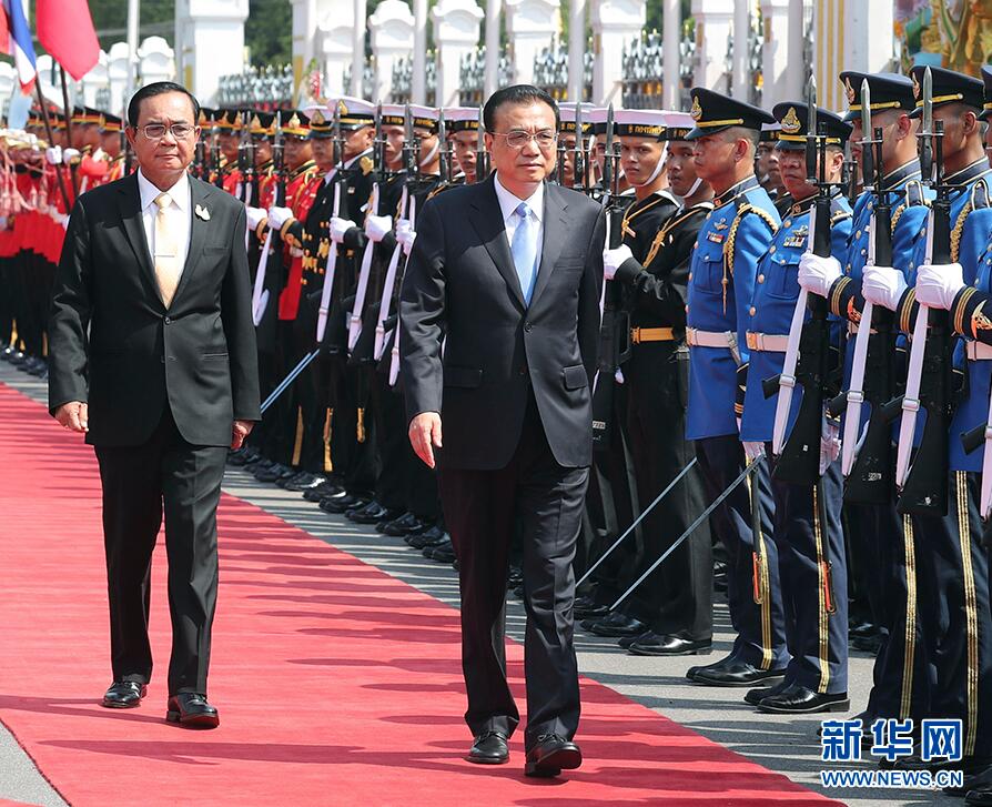 会谈前,巴育在总理府前广场为李克强举行隆重欢迎仪式。两国总理登上检阅台,军乐队高奏中泰两国国歌。李克强在巴育陪同下检阅了仪仗队。
