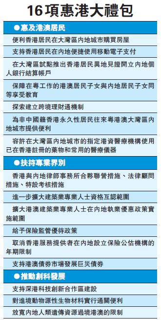行政長官林鄭月娥昨日出席粵港澳大灣區建設領導小組會議後見傳媒時透露,中央政府於領導小組會議後公布十六項普及惠民及便利香港專業界別到大灣區發展的政策措施(見表)。有關措施將進一步便利港人在大灣區內地城市發展、就業和居住,以及加強大灣區內人流、物流、資金流等方面便捷流通。林鄭對此表示歡迎,並會切實與相關中央部委和廣東省政府跟進落實有關政策。