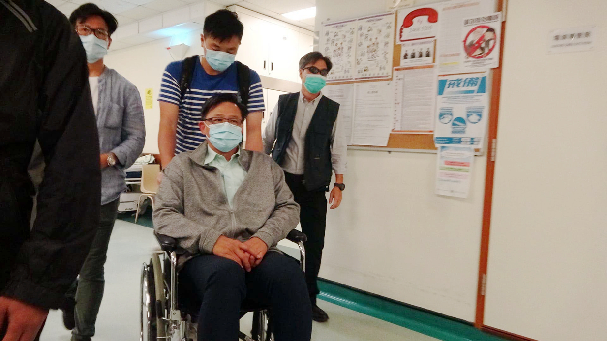 何君堯昨日下午坐輪椅出院,有多名警員護送離開。
