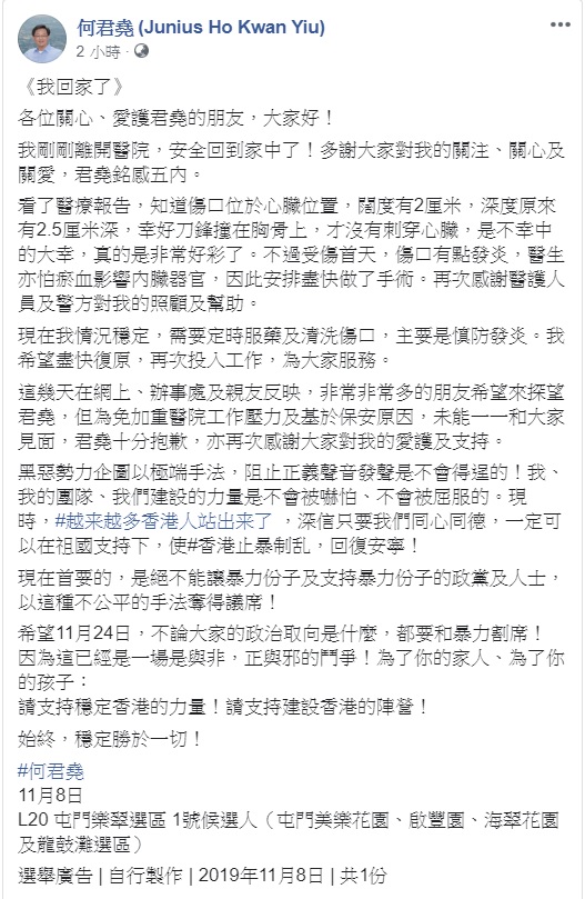 稍後,何君堯在社交媒體Facebook發文,指自己已回到家中,感謝大家關心,他指刀鋒因撞在胸骨上,沒有刺穿其心臟,形容為「不幸中的大幸」,他又稱自己現在情況穩定,需要定時服藥及清洗傷口,主要是慎防發炎。