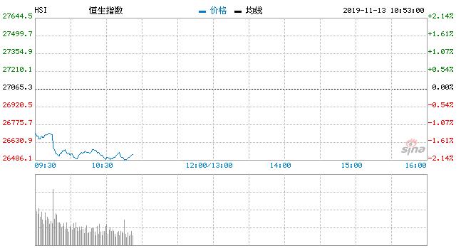 11月13日消息,港股恒指跌幅扩大至2%,蓝筹地产股集体暴跌,九龙仓置业(42.05, -1.80, -4.11%)跌近5%领跌蓝筹;新世界发展(10.44, -0.56, -5.09%)跌3.45%;恒基地产(37.1, -1.25, -3.26%)跌2.87%。此外,石油股、汽车股。内房股。内险股也集体下跌。消费、黄金股逆市走高。中国抗体再跌10%,昨日上市首日大跌21%。