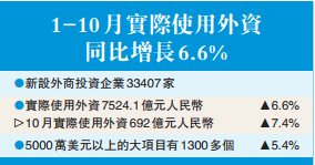 【香港商報訊】記者張麗娟報道:商務部昨日公布的數據顯示,中國1-10月實際使用外資7524.1億元人民幣,同比增長6.6%。10月當月實際使用外資692億元,增長7.4%。商務部外資司負責人昨日表示,今年利用外資保持了穩中有進的態勢,預計全年吸收外資規模將繼續保持穩定,「穩外資」目標定能實現。同時,商務部還強調,中國亦沒有出現大規模外資撤離情況。