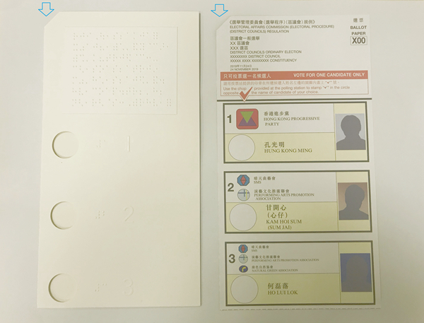 選舉事務處澄清指,選票正面的左上角都有一個切角(藍色標示),方便視障選民識別選票,是否正確地放入點字模版以供他們自行填畫,而不是坊間所說的「記認」。