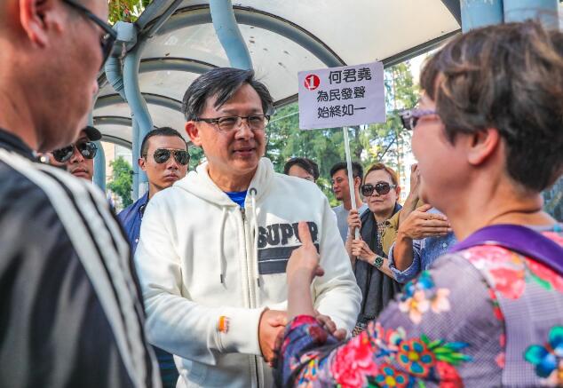 何君堯昨日在選區拉票,大受街坊歡迎。他籲請選民要用選票止暴制亂,否決外國勢力及其「走狗」;又慨嘆在暴力示威中被捕的年輕人受到荼毒。他期望選舉可做到文明、公平、安全,立下香港典範;鼓勵香港人要加油,而且要加「優質的油」,為社區做事。