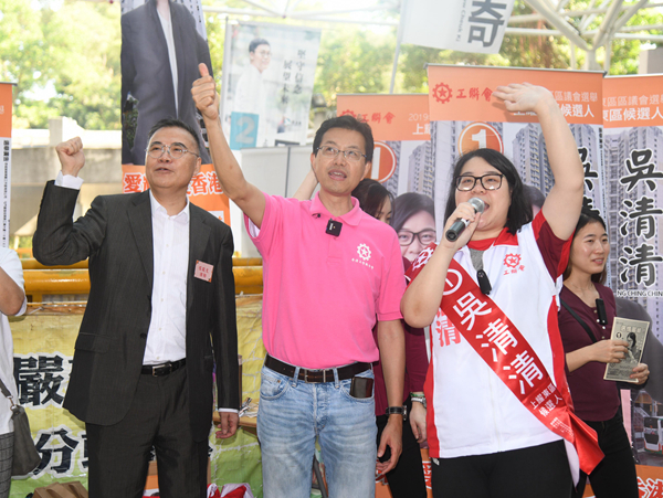 吳秋北(中)為候選人站台打氣,指香港正面對黑色恐怖。記者蔡啟文攝