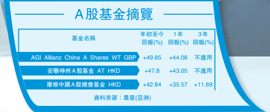 同時,晨星(亞洲)的數據顯示,年初至昨日止,在中國股票——A股的基金類別中,表現最好的首三隻基金為「AGI Allianz China A Shares WT GBP」、「安聯神州A股基金 AT HKD」及「摩根中國A股機會基金 HKD」,分別錄得49.85%、47.8%及42.84%回報。