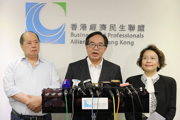 經民聯主席盧偉國(中)表示,區選結果未如理想,會就地區策略深刻反省。中通社