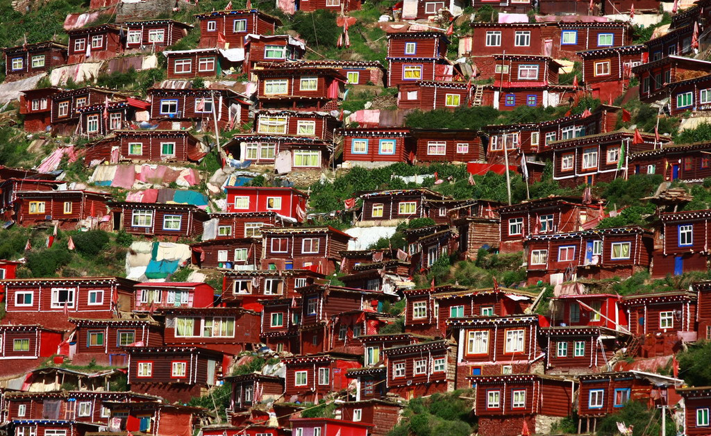色达喇荣五明佛学院地处四川甘孜州一个县,海拔4000米上,是个蔵传佛教寺庙集中的地方,全部为红教(宁玛派),是世界上最大的佛学院。每逢冬日,依山而建的密密麻麻绛红色小木屋,屋顶覆盖着洁白的雪与红色的墙,红白色彩强烈,宛如一片红白相间绵延无穷的海洋。雪后的景观让远离凡尘的雪域佛国更加纯净壮观。