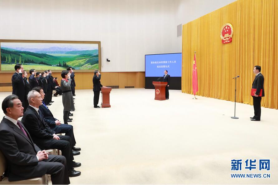 宣誓后,李克强说,忠于宪法、遵守法律是每一名公职人员必须遵循的基本行为准则,让人民过上好日子是每一名公职人员必须谨记的奋斗目标。他要求大家坚持以习近平新时代中国特色社会主义思想为指导,依法履职,为民履职,实干履职,廉洁履职。带头尊法学法守法用法,积极推进改革创新,在攻坚克难中彰显担当,在狠抓落实中展现作为,严守纪律规矩,严格秉公用权,勤俭办事,厉行节约,倾情竭力把人民群众最关切最期盼的事情办实办好,齐心协力推动经济社会持续健康发展。