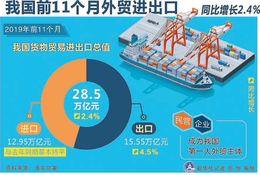 前11個月,民營企業進出口12.12萬億元,增長10.4%,佔外貿總值的42.5%,比去年同期提升3.1個百分點,成為內地第一大外貿主體。其中,出口8萬億元,增長12.4%,佔出口總值的51.4%;進口4.12萬億元,增長6.5%,佔進口總值的31.8%。