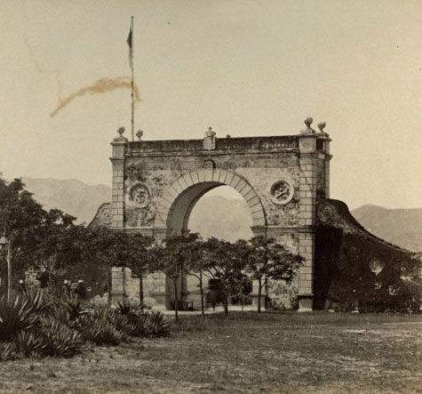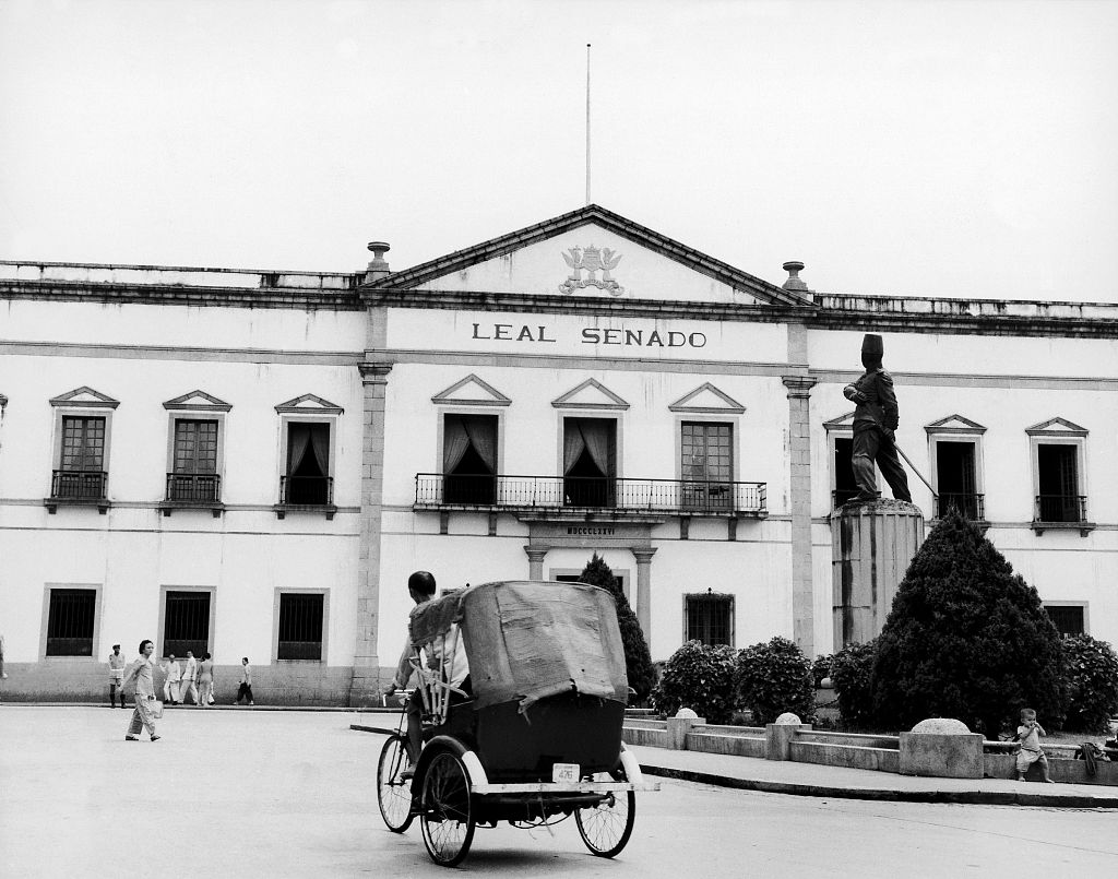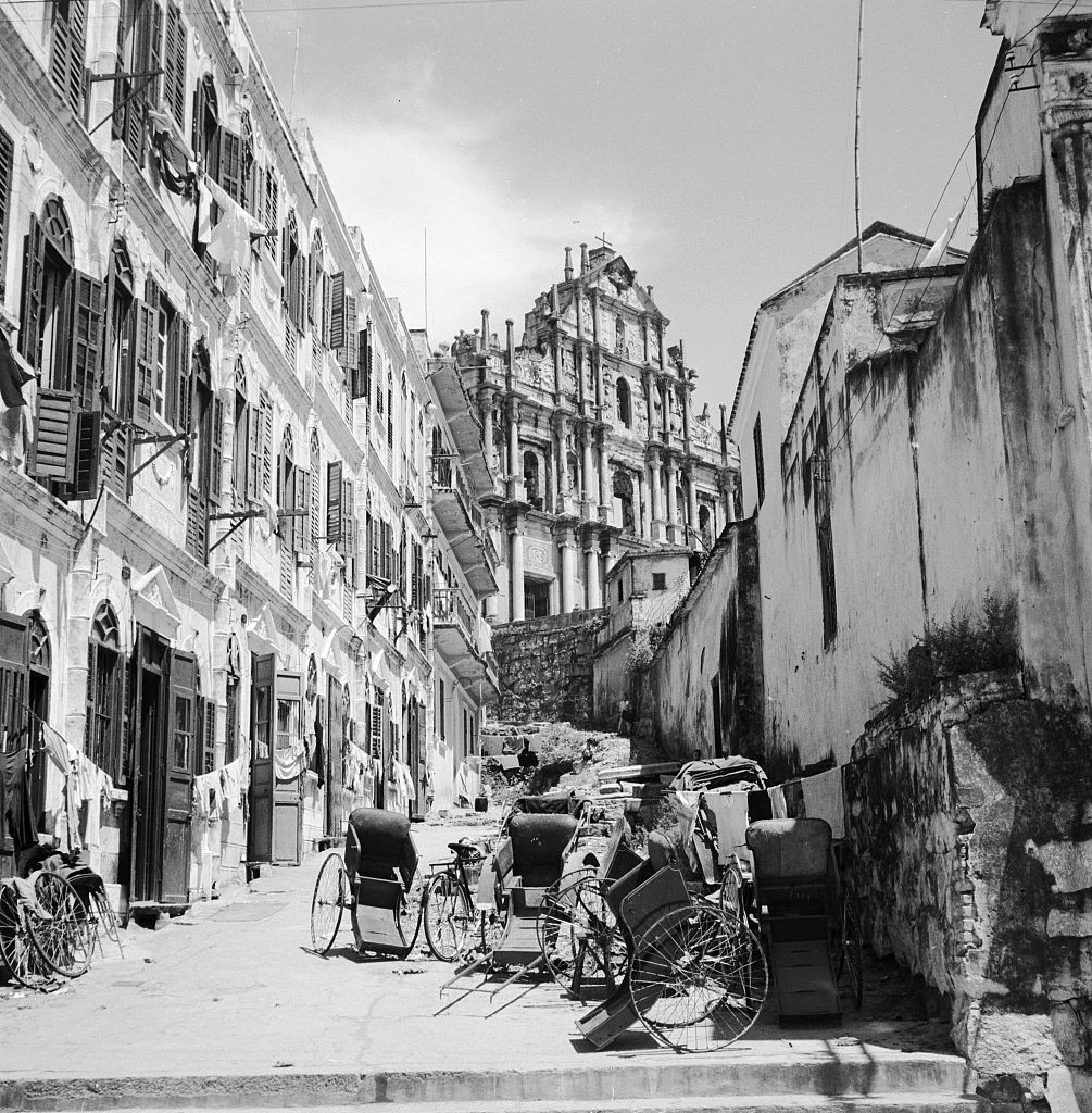 约1953年,澳门,大三八牌坊,也就是圣保罗大教堂遗址的前壁。大三巴牌坊是澳门最具代表性的名胜古迹,1580年葡萄牙人在澳门建起了这座教堂,取名“圣保禄”教堂。后来,教堂两次毁于火灾。只剩下耗资3万两白银的前壁,这就成了今天的大三巴牌坊。教堂成为遗址之后,因前壁与中国传统牌坊相似,加上“圣保禄”从葡文音译成中文,说成“三巴”,才有大三巴牌坊的称谓。