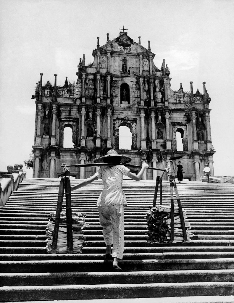 1963年1月,澳门,一个年轻的女子正在攀爬圣保罗大教堂外的楼梯。
