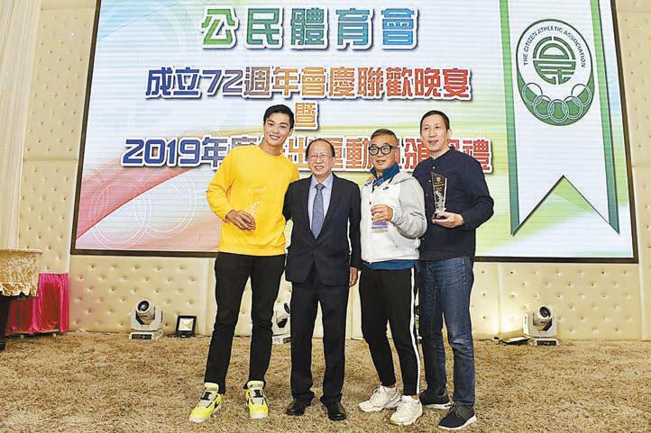 在公民體育會成立72 周年會慶聯歡晚宴上,貝鈞奇(左二)頒發「2019 年度傑出運動員」獎項予籃球運動員謝爕雋(左一),以及頒發「2019 年度傑出教練」獎項予籃球隊教練周華傑(右二)和鄧基榮。